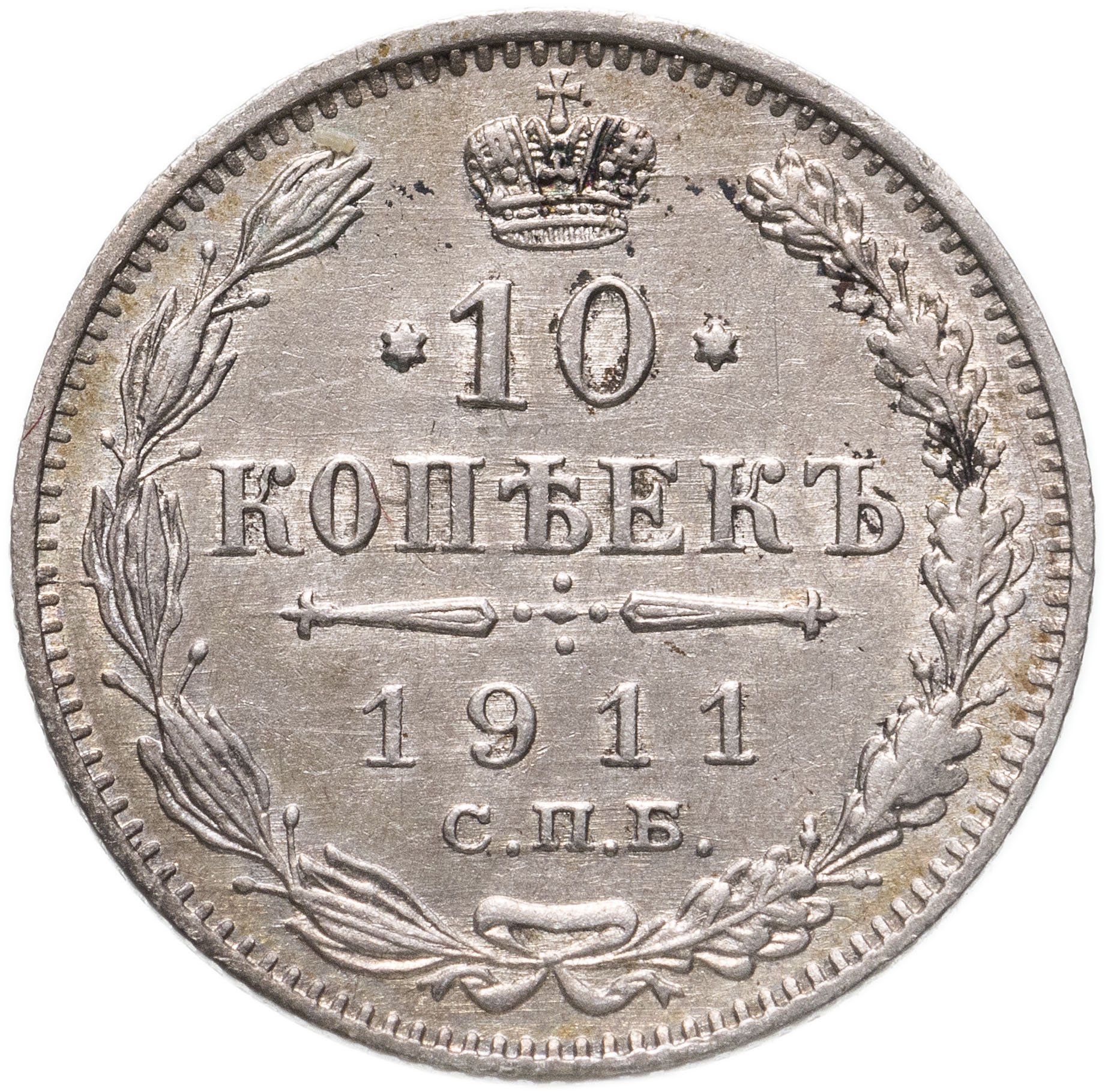 В центре указан номинал «10», ограниченный с обеих сторон звездочками. Над цифрой – Корона Российской империи. Под цифрой номинала — слово "КОПЕЕК". Ниже, расположен декоративный разделитель в виде двух разнонаправленных фигурных линий и стилизованным из точек крестом между ними. Под разделителем — дата выпуска монеты «1911». Под цифрой даты — обозначение монетного двора «С.П.Б.». Вдоль канта, не доходя до короны, изображен венок из лавровой и дубовой ветви, которые в нижней части перевязаны лентой на узел бантом. По окружности канта имеются рельефные элементы, выполненные в виде зубцов.