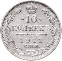 В центре указан номинал «10», ограниченный с обеих сторон звездочками. Над цифрой – Корона Российской империи. Под цифрой номинала — слово "КОПЕЕК". Ниже, расположен декоративный разделитель в виде двух разнонаправленных фигурных линий и стилизованным из точек крестом между ними. Под разделителем — дата выпуска монеты «1911». Под цифрой даты — обозначение монетного двора «С.П.Б.». Вдоль канта, не доходя до короны, изображен венок из лавровой и дубовой ветви, которые в нижней части перевязаны лентой на узел бантом. По окружности канта имеются рельефные элементы, выполненные в виде зубцов.