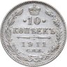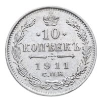 В центре указан номинал «10», ограниченный с обеих сторон звездочками. Над цифрой – Корона Российской империи. Под цифрой номинала — слово "КОПЕЕК". Ниже, расположен декоративный разделитель в виде двух разнонаправленных фигурных линий и стилизованным из точек крестом между ними. Под разделителем — дата выпуска монеты «1911». Под цифрой даты — обозначение монетного двора «С.П.Б.». Вдоль канта, не доходя до короны, изображен венок из лавровой и дубовой ветви, которые в нижней части перевязаны лентой на узел бантом. По окружности канта имеются рельефные элементы, выполненные в виде зубцов.