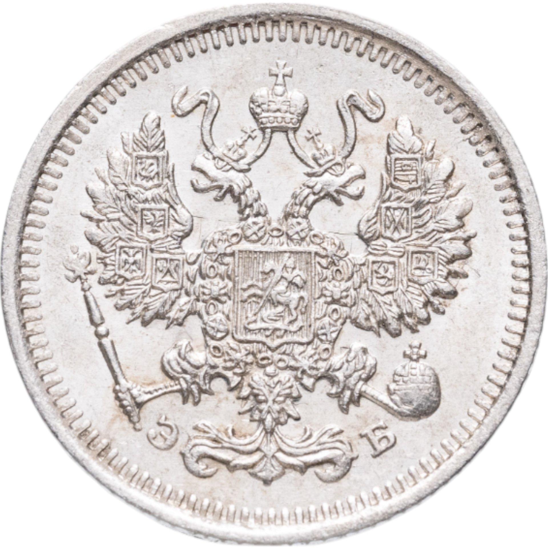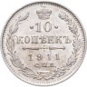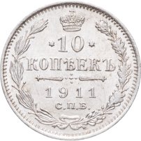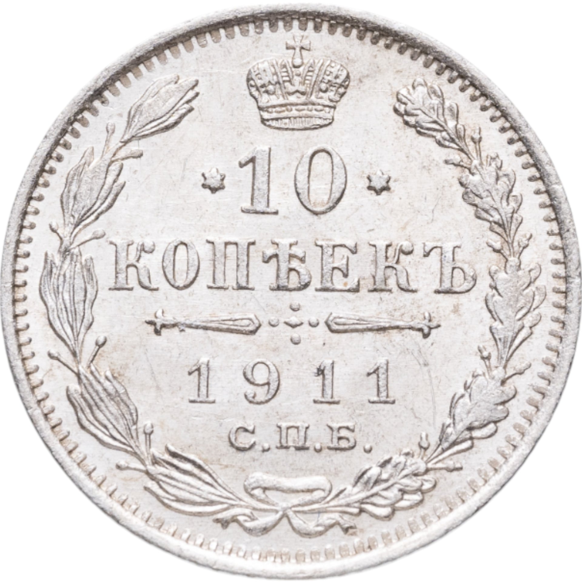 В центре указан номинал «10», ограниченный с обеих сторон звездочками. Над цифрой – Корона Российской империи. Под цифрой номинала — слово "КОПЕЕК". Ниже, расположен декоративный разделитель в виде двух разнонаправленных фигурных линий и стилизованным из точек крестом между ними. Под разделителем — дата выпуска монеты «1911». Под цифрой даты — обозначение монетного двора «С.П.Б.». Вдоль канта, не доходя до короны, изображен венок из лавровой и дубовой ветви, которые в нижней части перевязаны лентой на узел бантом. По окружности канта имеются рельефные элементы, выполненные в виде зубцов.