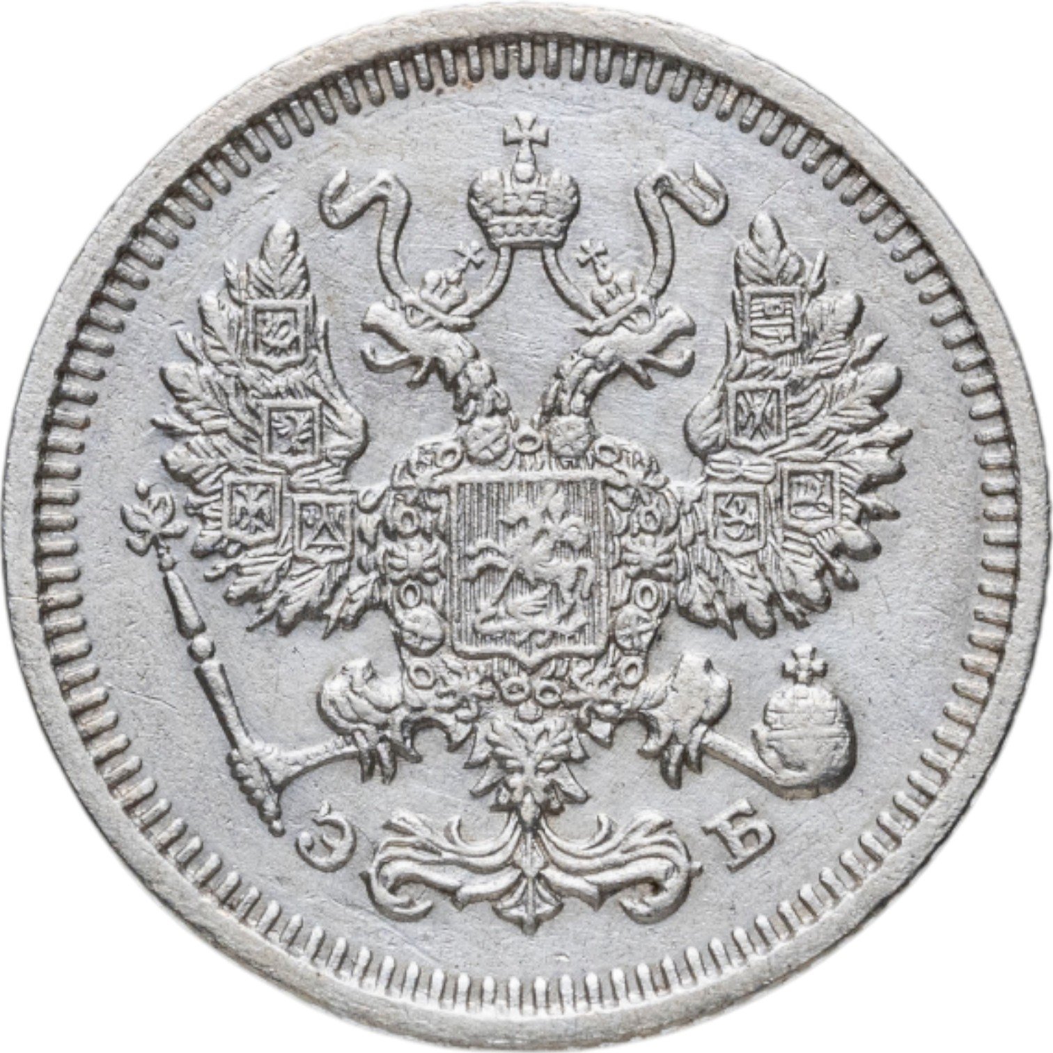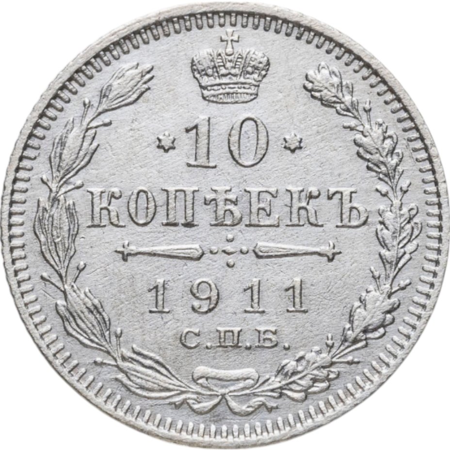 В центре указан номинал «10», ограниченный с обеих сторон звездочками. Над цифрой – Корона Российской империи. Под цифрой номинала — слово "КОПЕЕК". Ниже, расположен декоративный разделитель в виде двух разнонаправленных фигурных линий и стилизованным из точек крестом между ними. Под разделителем — дата выпуска монеты «1911». Под цифрой даты — обозначение монетного двора «С.П.Б.». Вдоль канта, не доходя до короны, изображен венок из лавровой и дубовой ветви, которые в нижней части перевязаны лентой на узел бантом. По окружности канта имеются рельефные элементы, выполненные в виде зубцов.