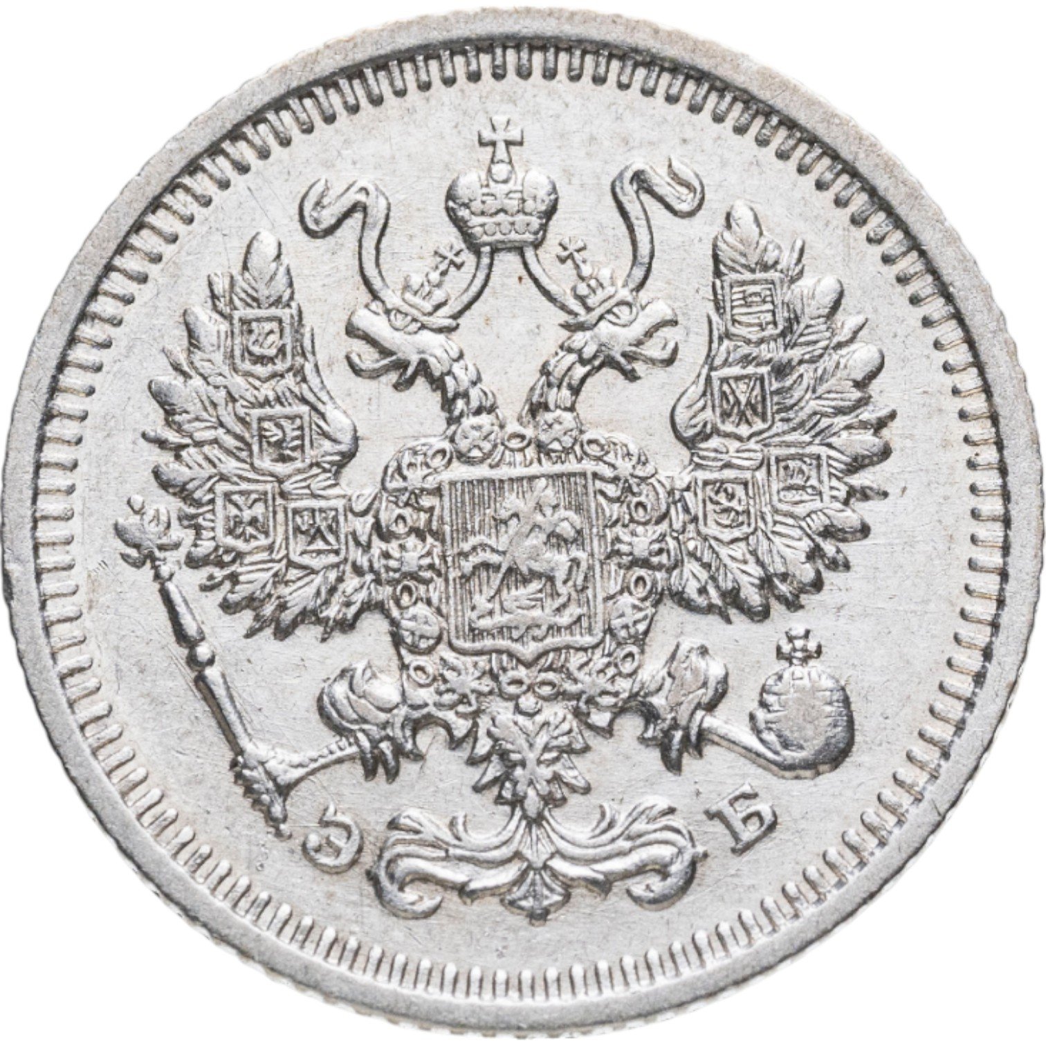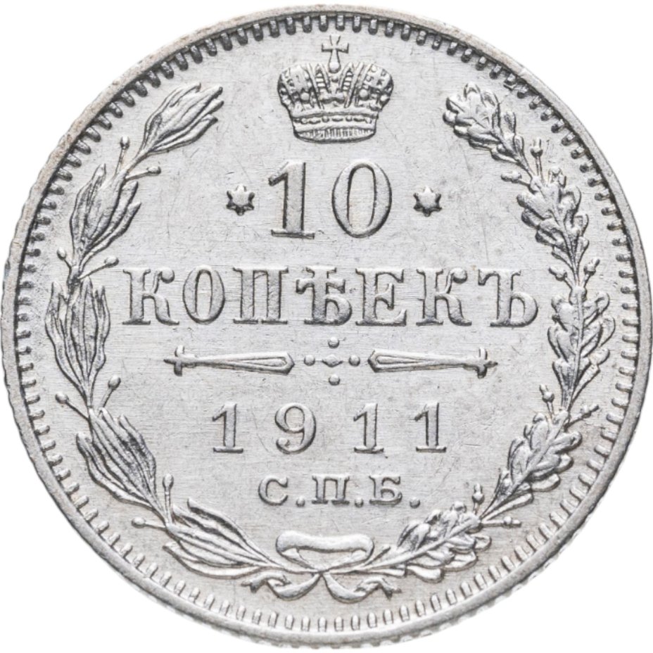 В центре указан номинал «10», ограниченный с обеих сторон звездочками. Над цифрой – Корона Российской империи. Под цифрой номинала — слово "КОПЕЕК". Ниже, расположен декоративный разделитель в виде двух разнонаправленных фигурных линий и стилизованным из точек крестом между ними. Под разделителем — дата выпуска монеты «1911». Под цифрой даты — обозначение монетного двора «С.П.Б.». Вдоль канта, не доходя до короны, изображен венок из лавровой и дубовой ветви, которые в нижней части перевязаны лентой на узел бантом. По окружности канта имеются рельефные элементы, выполненные в виде зубцов.