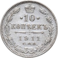 В центре указан номинал «10», ограниченный с обеих сторон звездочками. Над цифрой – Корона Российской империи. Под цифрой номинала — слово "КОПЕЕК". Ниже, расположен декоративный разделитель в виде двух разнонаправленных фигурных линий и стилизованным из точек крестом между ними. Под разделителем — дата выпуска монеты «1911». Под цифрой даты — обозначение монетного двора «С.П.Б.». Вдоль канта, не доходя до короны, изображен венок из лавровой и дубовой ветви, которые в нижней части перевязаны лентой на узел бантом. По окружности канта имеются рельефные элементы, выполненные в виде зубцов.