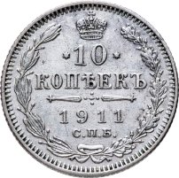 В центре указан номинал «10», ограниченный с обеих сторон звездочками. Над цифрой – Корона Российской империи. Под цифрой номинала — слово "КОПЕЕК". Ниже, расположен декоративный разделитель в виде двух разнонаправленных фигурных линий и стилизованным из точек крестом между ними. Под разделителем — дата выпуска монеты «1911». Под цифрой даты — обозначение монетного двора «С.П.Б.». Вдоль канта, не доходя до короны, изображен венок из лавровой и дубовой ветви, которые в нижней части перевязаны лентой на узел бантом. По окружности канта имеются рельефные элементы, выполненные в виде зубцов.