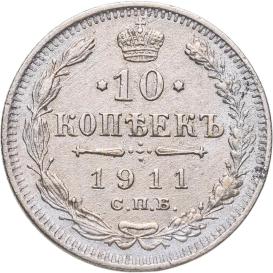 В центре указан номинал «10», ограниченный с обеих сторон звездочками. Над цифрой – Корона Российской империи. Под цифрой номинала — слово "КОПЕЕК". Ниже, расположен декоративный разделитель в виде двух разнонаправленных фигурных линий и стилизованным из точек крестом между ними. Под разделителем — дата выпуска монеты «1911». Под цифрой даты — обозначение монетного двора «С.П.Б.». Вдоль канта, не доходя до короны, изображен венок из лавровой и дубовой ветви, которые в нижней части перевязаны лентой на узел бантом. По окружности канта имеются рельефные элементы, выполненные в виде зубцов.