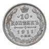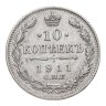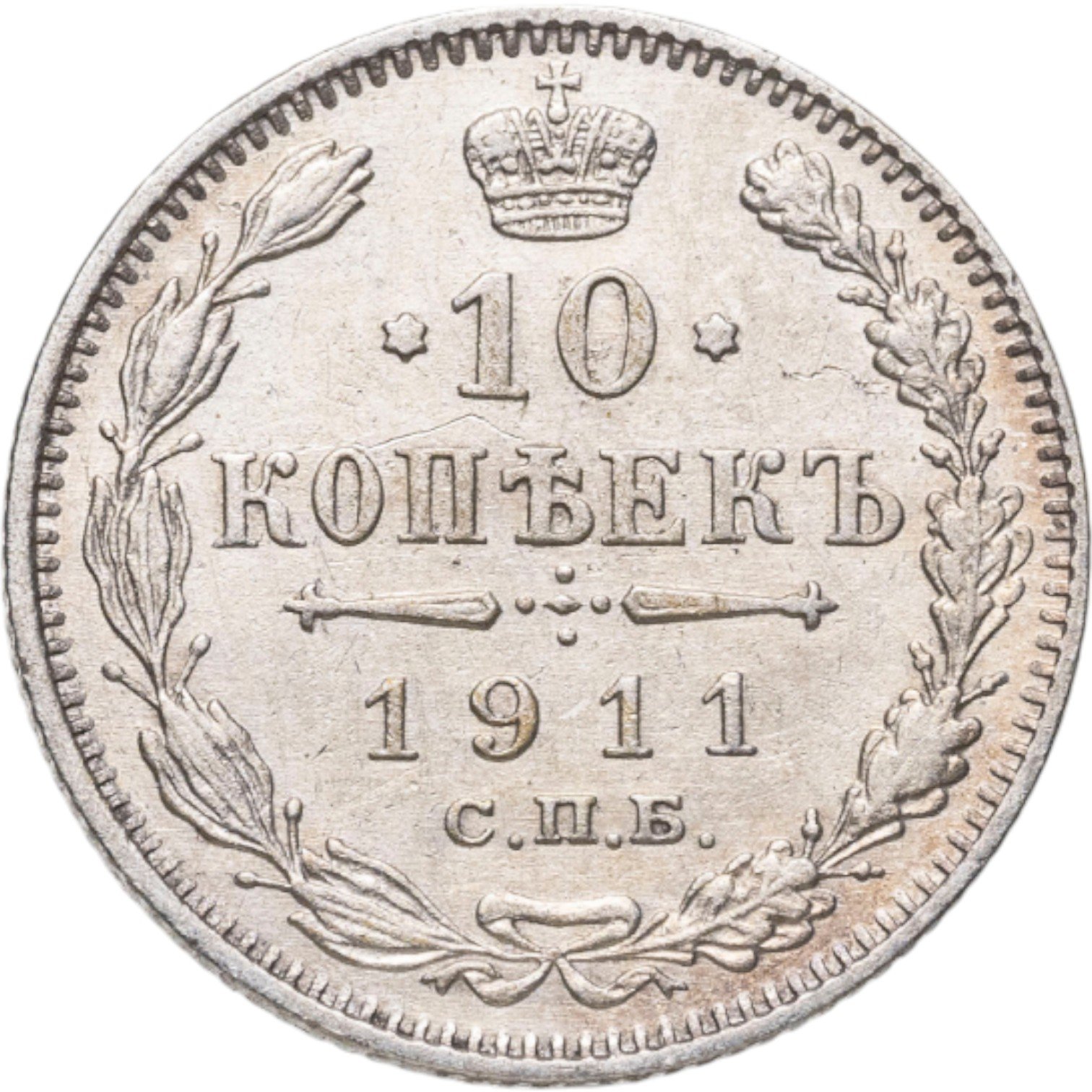 В центре указан номинал «10», ограниченный с обеих сторон звездочками. Над цифрой – Корона Российской империи. Под цифрой номинала — слово "КОПЕЕК". Ниже, расположен декоративный разделитель в виде двух разнонаправленных фигурных линий и стилизованным из точек крестом между ними. Под разделителем — дата выпуска монеты «1911». Под цифрой даты — обозначение монетного двора «С.П.Б.». Вдоль канта, не доходя до короны, изображен венок из лавровой и дубовой ветви, которые в нижней части перевязаны лентой на узел бантом. По окружности канта имеются рельефные элементы, выполненные в виде зубцов.