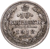 В центре указан номинал «10», ограниченный с обеих сторон звездочками. Над цифрой – Корона Российской империи. Под цифрой номинала — слово "КОПЕЕК". Ниже, расположен декоративный разделитель в виде двух разнонаправленных фигурных линий и стилизованным из точек крестом между ними. Под разделителем — дата выпуска монеты «1912». Под цифрой даты — обозначение монетного двора «С.П.Б.». Вдоль канта, не доходя до короны, изображен венок из лавровой и дубовой ветви, которые в нижней части перевязаны лентой на узел бантом. По окружности канта имеются рельефные элементы, выполненные в виде зубцов.