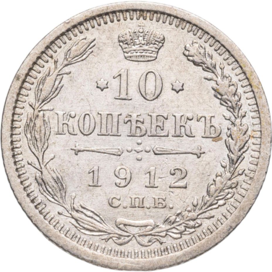 В центре указан номинал «10», ограниченный с обеих сторон звездочками. Над цифрой – Корона Российской империи. Под цифрой номинала — слово "КОПЕЕК". Ниже, расположен декоративный разделитель в виде двух разнонаправленных фигурных линий и стилизованным из точек крестом между ними. Под разделителем — дата выпуска монеты «1912». Под цифрой даты — обозначение монетного двора «С.П.Б.». Вдоль канта, не доходя до короны, изображен венок из лавровой и дубовой ветви, которые в нижней части перевязаны лентой на узел бантом. По окружности канта имеются рельефные элементы, выполненные в виде зубцов.