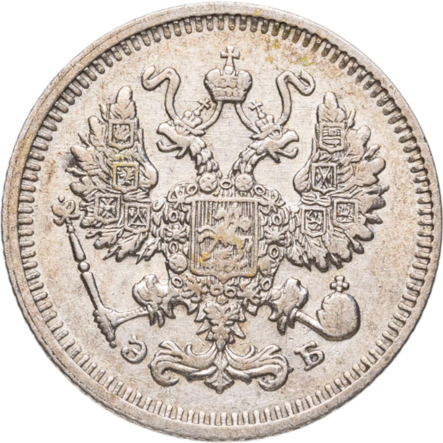 В центре изображен Малый Государственный Герб Российской империи - двуглавый орёл, головы которого увенчаны двумя коронами, третья, большая корона над ними. Все они соединены орденской лентой ордена Св. Апостола Андрея Первозванного. На груди орла расположен Московский герб, в щите изображен Георгий Победоносец с копьем поражающий дракона. Вокруг щита цепь ордена Св. Апостола Андрея Первозванного. На крыльях изображены гербы: Царства Казанского, Польского, Херсонеса Таврического, Астраханского, Сибирского, Грузинского и герб соединенных княжеств Киевского, Новгородского и Владимирского — по 4 на каждое крыло. В правой лапе орла – скипетр, в левой – держава. Под правой лапой – буква «Э», под левой – буква «Б». Инициалы минцмейстера Эликума Бабаянца. По окружности канта имеются рельефные элементы, выполненные в виде зубцов.