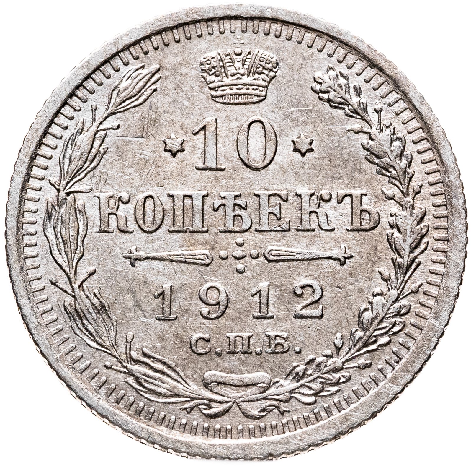 В центре указан номинал «10», ограниченный с обеих сторон звездочками. Над цифрой – Корона Российской империи. Под цифрой номинала — слово "КОПЕЕК". Ниже, расположен декоративный разделитель в виде двух разнонаправленных фигурных линий и стилизованным из точек крестом между ними. Под разделителем — дата выпуска монеты «1912». Под цифрой даты — обозначение монетного двора «С.П.Б.». Вдоль канта, не доходя до короны, изображен венок из лавровой и дубовой ветви, которые в нижней части перевязаны лентой на узел бантом. По окружности канта имеются рельефные элементы, выполненные в виде зубцов.