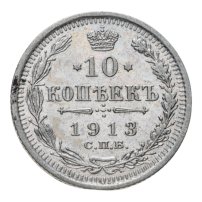 В центре указан номинал «10», ограниченный с обеих сторон звездочками. Над цифрой – Корона Российской империи. Под цифрой номинала — слово "КОПЕЕК". Ниже, расположен декоративный разделитель в виде двух разнонаправленных фигурных линий и стилизованным из точек крестом между ними. Под разделителем — дата выпуска монеты «1913». Под цифрой даты — обозначение монетного двора «С.П.Б.». Вдоль канта, не доходя до короны, изображен венок из лавровой и дубовой ветви, которые в нижней части перевязаны лентой на узел бантом. По окружности канта имеются рельефные элементы, выполненные в виде зубцов.