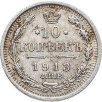 В центре указан номинал «10», ограниченный с обеих сторон звездочками. Над цифрой – Корона Российской империи. Под цифрой номинала — слово "КОПЕЕК". Ниже, расположен декоративный разделитель в виде двух разнонаправленных фигурных линий и стилизованным из точек крестом между ними. Под разделителем — дата выпуска монеты «1913». Под цифрой даты — обозначение монетного двора «С.П.Б.». Вдоль канта, не доходя до короны, изображен венок из лавровой и дубовой ветви, которые в нижней части перевязаны лентой на узел бантом. По окружности канта имеются рельефные элементы, выполненные в виде зубцов.