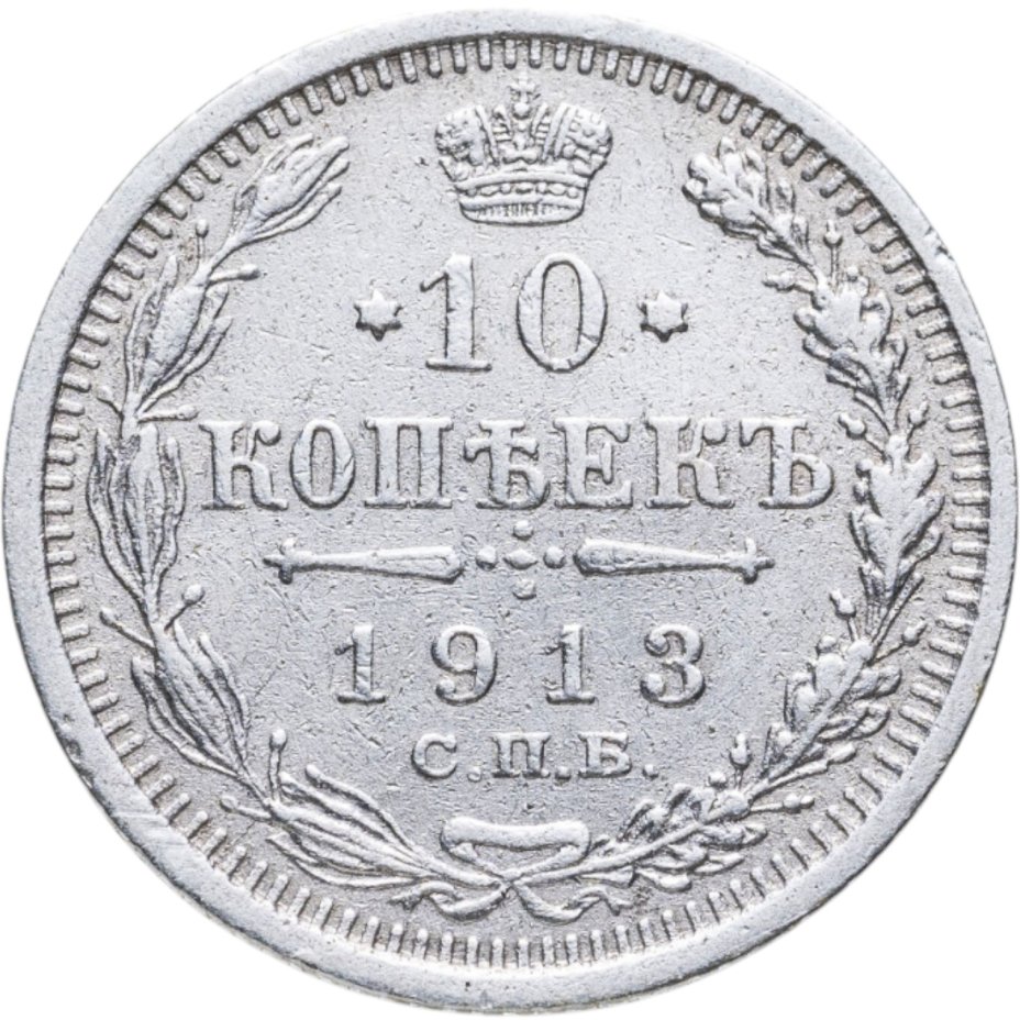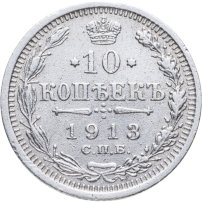 В центре указан номинал «10», ограниченный с обеих сторон звездочками. Над цифрой – Корона Российской империи. Под цифрой номинала — слово "КОПЕЕК". Ниже, расположен декоративный разделитель в виде двух разнонаправленных фигурных линий и стилизованным из точек крестом между ними. Под разделителем — дата выпуска монеты «1913». Под цифрой даты — обозначение монетного двора «С.П.Б.». Вдоль канта, не доходя до короны, изображен венок из лавровой и дубовой ветви, которые в нижней части перевязаны лентой на узел бантом. По окружности канта имеются рельефные элементы, выполненные в виде зубцов.