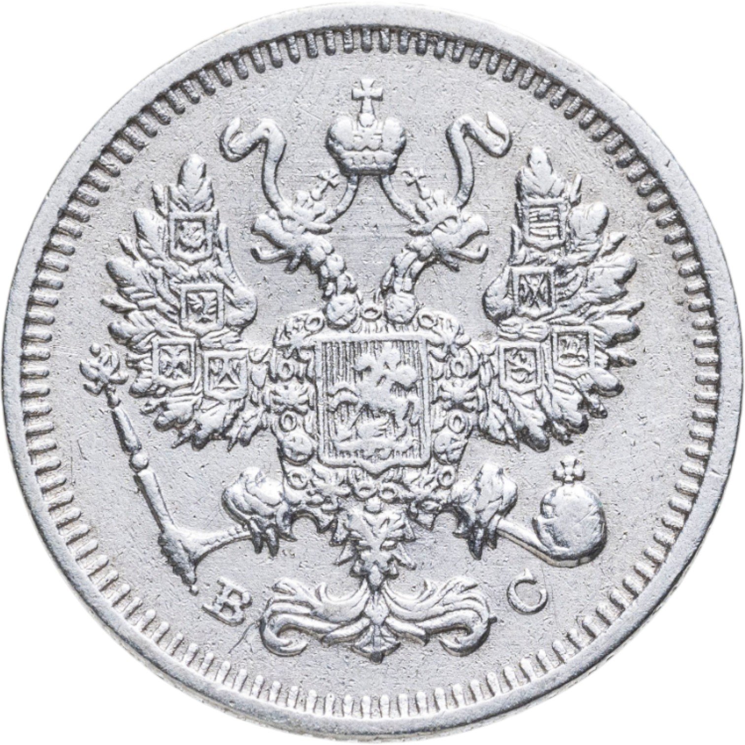 В центре изображен Малый Государственный Герб Российской империи - двуглавый орёл, головы которого увенчаны двумя коронами, третья, большая корона над ними. Все они соединены орденской лентой ордена Св. Апостола Андрея Первозванного. На груди орла расположен Московский герб, в щите изображен Георгий Победоносец с копьем поражающий дракона. Вокруг щита цепь ордена Св. Апостола Андрея Первозванного. На крыльях изображены гербы: Царства Казанского, Польского, Херсонеса Таврического, Астраханского, Сибирского, Грузинского и герб соединенных княжеств Киевского, Новгородского и Владимирского — по 4 на каждое крыло. В правой лапе орла – скипетр, в левой – держава. Под правой лапой – буква «В», под левой – буква «С». Инициалы минцмейстера Виктора Смирнова. По окружности канта имеются рельефные элементы, выполненные в виде зубцов.