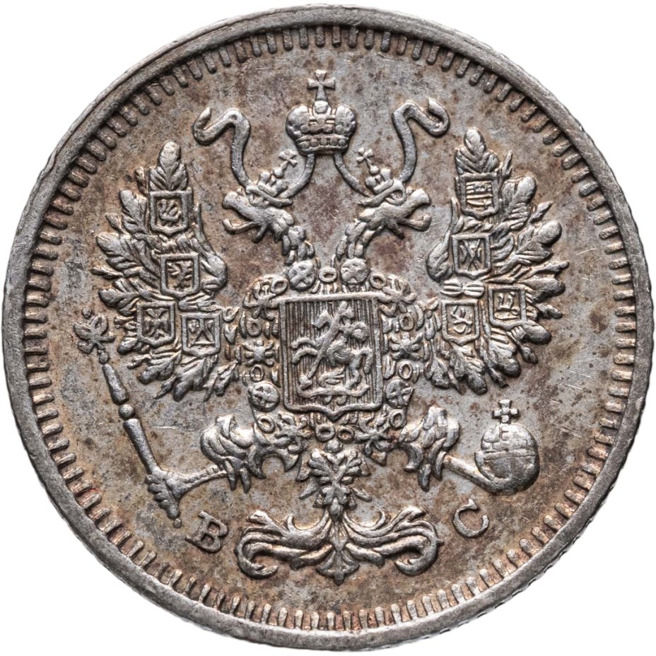 В центре изображен Малый Государственный Герб Российской империи - двуглавый орёл, головы которого увенчаны двумя коронами, третья, большая корона над ними. Все они соединены орденской лентой ордена Св. Апостола Андрея Первозванного. На груди орла расположен Московский герб, в щите изображен Георгий Победоносец с копьем поражающий дракона. Вокруг щита цепь ордена Св. Апостола Андрея Первозванного. На крыльях изображены гербы: Царства Казанского, Польского, Херсонеса Таврического, Астраханского, Сибирского, Грузинского и герб соединенных княжеств Киевского, Новгородского и Владимирского — по 4 на каждое крыло. В правой лапе орла – скипетр, в левой – держава. Под правой лапой – буква «В», под левой – буква «С». Инициалы минцмейстера Виктора Смирнова. По окружности канта имеются рельефные элементы, выполненные в виде зубцов.