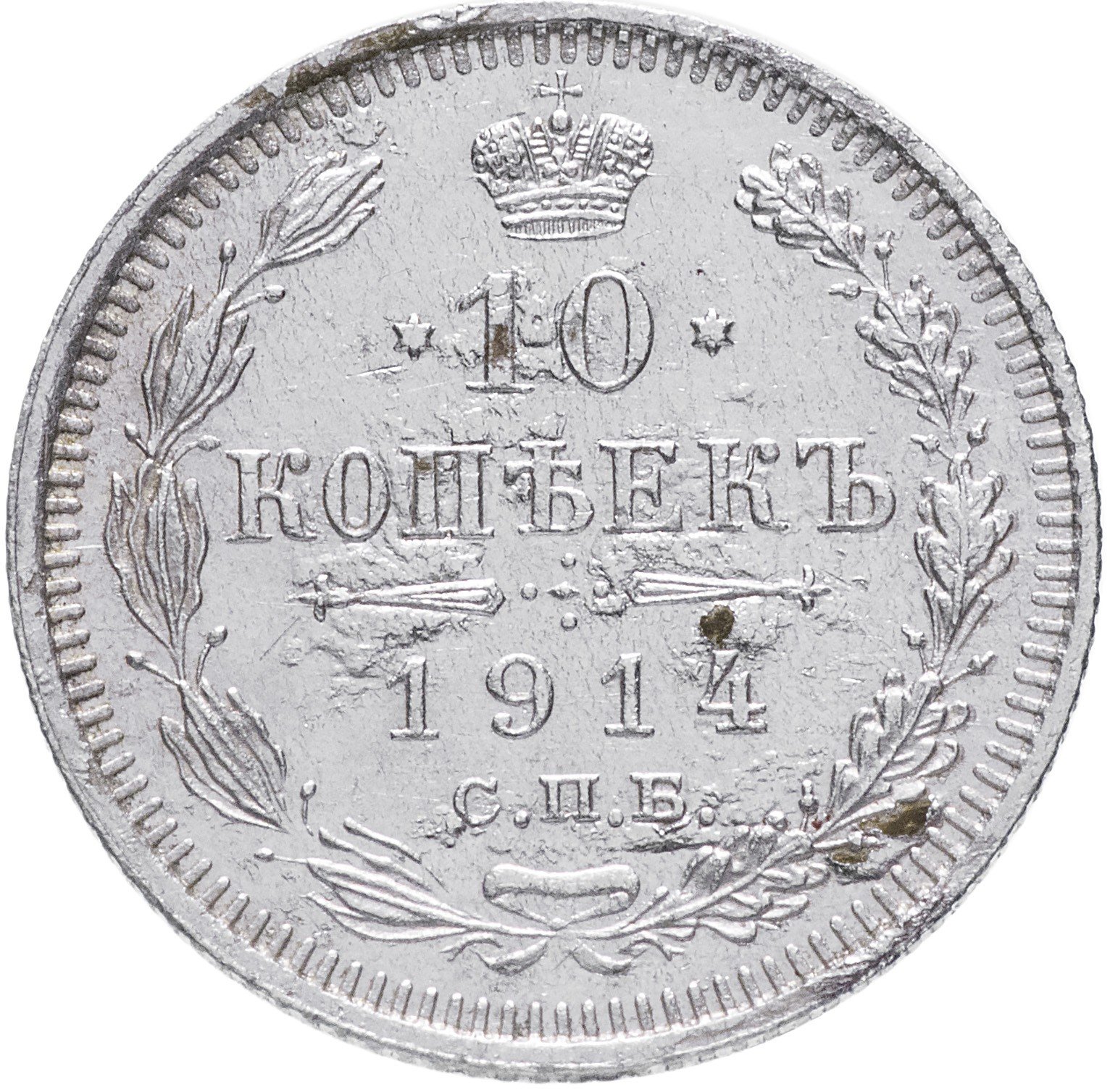В центре указан номинал «10», ограниченный с обеих сторон звездочками. Над цифрой – Корона Российской империи. Под цифрой номинала — слово "КОПЕЕК". Ниже, расположен декоративный разделитель в виде двух разнонаправленных фигурных линий и стилизованным из точек крестом между ними. Под разделителем — дата выпуска монеты «1914». Под цифрой даты — обозначение монетного двора «С.П.Б.». Вдоль канта, не доходя до короны, изображен венок из лавровой и дубовой ветви, которые в нижней части перевязаны лентой на узел бантом. По окружности канта имеются рельефные элементы, выполненные в виде зубцов.