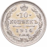 В центре указан номинал «10», ограниченный с обеих сторон звездочками. Над цифрой – Корона Российской империи. Под цифрой номинала — слово "КОПЕЕК". Ниже, расположен декоративный разделитель в виде двух разнонаправленных фигурных линий и стилизованным из точек крестом между ними. Под разделителем — дата выпуска монеты «1914». Под цифрой даты — обозначение монетного двора «С.П.Б.». Вдоль канта, не доходя до короны, изображен венок из лавровой и дубовой ветви, которые в нижней части перевязаны лентой на узел бантом. По окружности канта имеются рельефные элементы, выполненные в виде зубцов.