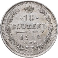 В центре указан номинал «10», ограниченный с обеих сторон звездочками. Над цифрой – Корона Российской империи. Под цифрой номинала — слово "КОПЕЕК". Ниже, расположен декоративный разделитель в виде двух разнонаправленных фигурных линий и стилизованным из точек крестом между ними. Под разделителем — дата выпуска монеты «1914». Под цифрой даты — обозначение монетного двора «С.П.Б.». Вдоль канта, не доходя до короны, изображен венок из лавровой и дубовой ветви, которые в нижней части перевязаны лентой на узел бантом. По окружности канта имеются рельефные элементы, выполненные в виде зубцов.