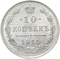 В центре указан номинал «10», ограниченный с обеих сторон звездочками. Над цифрой – Корона Российской империи. Под цифрой номинала — слово "КОПЕЕК". Ниже, расположен декоративный разделитель в виде двух разнонаправленных фигурных линий и стилизованным из точек крестом между ними. Под разделителем — дата выпуска монеты «1915». Вдоль канта, не доходя до короны, изображен венок из лавровой и дубовой ветви, которые в нижней части перевязаны лентой на узел бантом. По окружности канта имеются рельефные элементы, выполненные в виде зубцов.