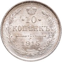 В центре указан номинал «10», ограниченный с обеих сторон звездочками. Над цифрой – Корона Российской империи. Под цифрой номинала — слово "КОПЕЕК". Ниже, расположен декоративный разделитель в виде двух разнонаправленных фигурных линий и стилизованным из точек крестом между ними. Под разделителем — дата выпуска монеты «1915». Вдоль канта, не доходя до короны, изображен венок из лавровой и дубовой ветви, которые в нижней части перевязаны лентой на узел бантом. По окружности канта имеются рельефные элементы, выполненные в виде зубцов.