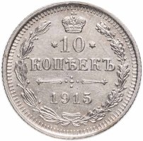 В центре указан номинал «10», ограниченный с обеих сторон звездочками. Над цифрой – Корона Российской империи. Под цифрой номинала — слово "КОПЕЕК". Ниже, расположен декоративный разделитель в виде двух разнонаправленных фигурных линий и стилизованным из точек крестом между ними. Под разделителем — дата выпуска монеты «1915». Вдоль канта, не доходя до короны, изображен венок из лавровой и дубовой ветви, которые в нижней части перевязаны лентой на узел бантом. По окружности канта имеются рельефные элементы, выполненные в виде зубцов.