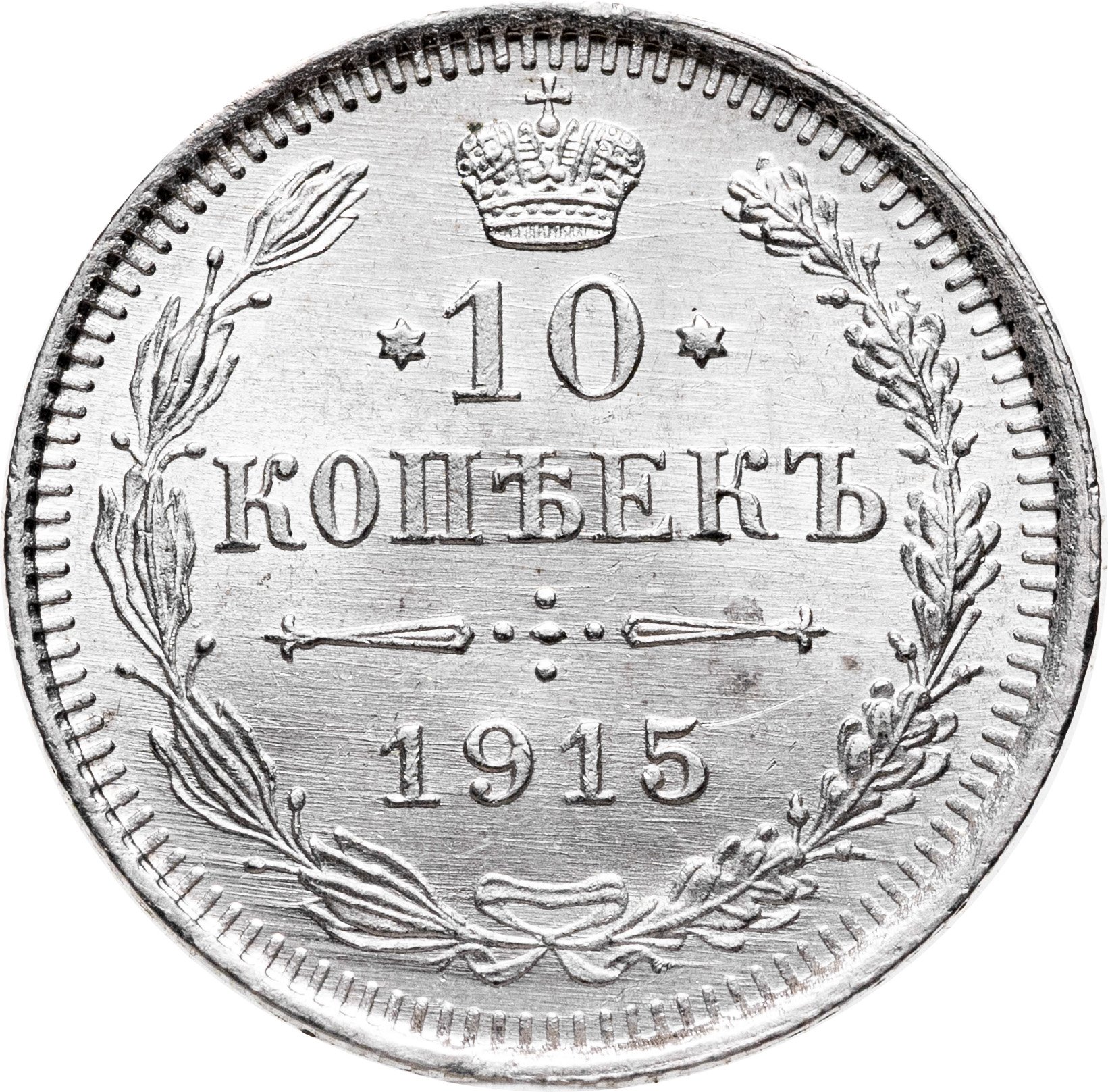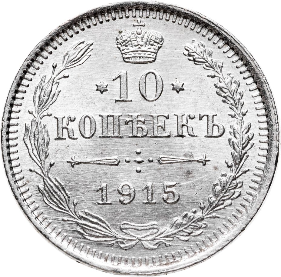В центре указан номинал «10», ограниченный с обеих сторон звездочками. Над цифрой – Корона Российской империи. Под цифрой номинала — слово "КОПЕЕК". Ниже, расположен декоративный разделитель в виде двух разнонаправленных фигурных линий и стилизованным из точек крестом между ними. Под разделителем — дата выпуска монеты «1915». Вдоль канта, не доходя до короны, изображен венок из лавровой и дубовой ветви, которые в нижней части перевязаны лентой на узел бантом. По окружности канта имеются рельефные элементы, выполненные в виде зубцов.