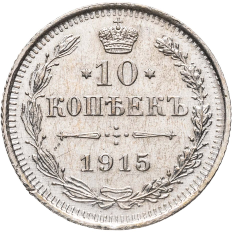 В центре указан номинал «10», ограниченный с обеих сторон звездочками. Над цифрой – Корона Российской империи. Под цифрой номинала — слово "КОПЕЕК". Ниже, расположен декоративный разделитель в виде двух разнонаправленных фигурных линий и стилизованным из точек крестом между ними. Под разделителем — дата выпуска монеты «1915». Вдоль канта, не доходя до короны, изображен венок из лавровой и дубовой ветви, которые в нижней части перевязаны лентой на узел бантом. По окружности канта имеются рельефные элементы, выполненные в виде зубцов.