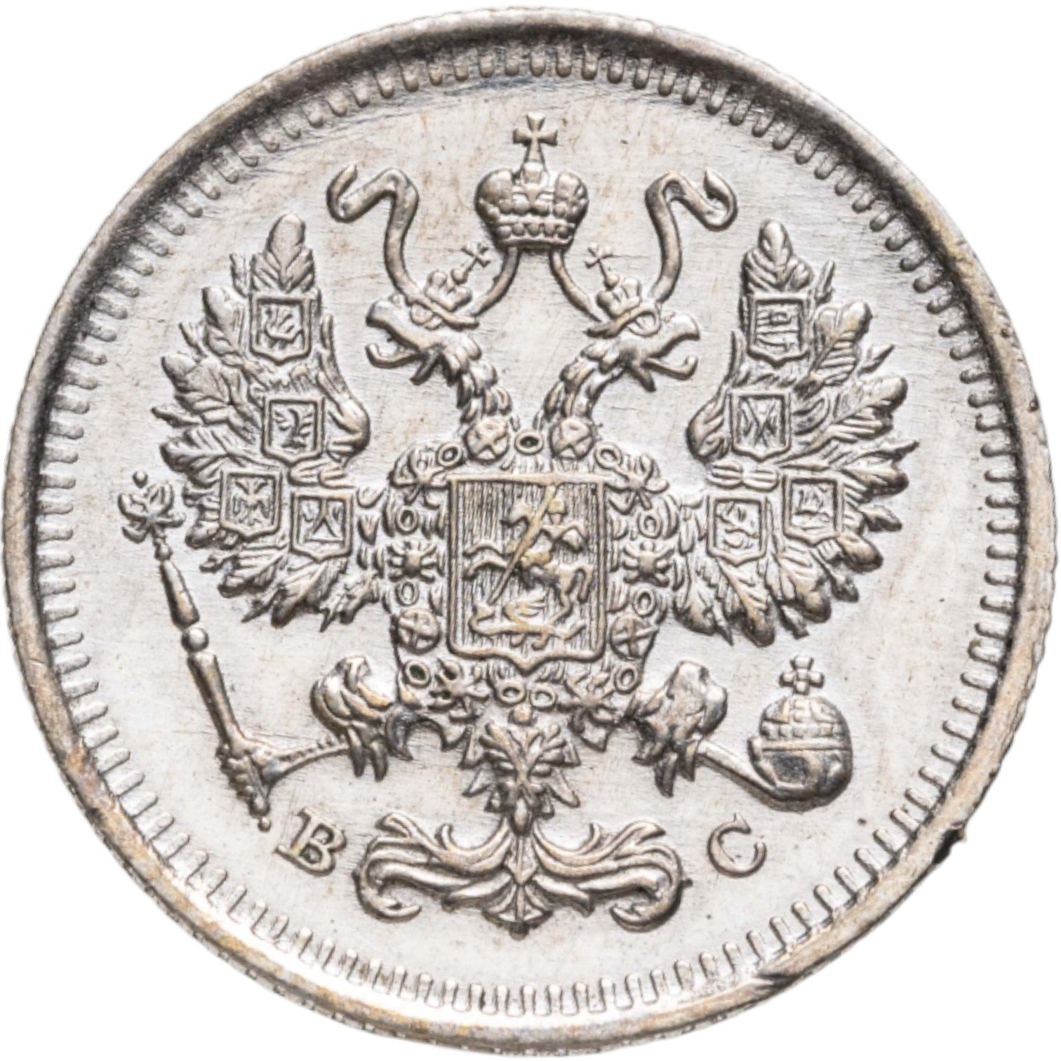 В центре изображен Малый Государственный Герб Российской империи - двуглавый орёл, головы которого увенчаны двумя коронами, третья, большая корона над ними. Все они соединены орденской лентой ордена Св. Апостола Андрея Первозванного. На груди орла расположен Московский герб, в щите изображен Георгий Победоносец с копьем поражающий дракона. Вокруг щита цепь ордена Св. Апостола Андрея Первозванного. На крыльях изображены гербы: Царства Казанского, Польского, Херсонеса Таврического, Астраханского, Сибирского, Грузинского и герб соединенных княжеств Киевского, Новгородского и Владимирского — по 4 на каждое крыло. В правой лапе орла – скипетр, в левой – держава. Под правой лапой – буква «В», под левой – буква «С». Инициалы минцмейстера Виктора Смирнова. По окружности канта имеются рельефные элементы, выполненные в виде зубцов.