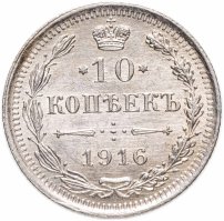 В центре указан номинал «10», ограниченный с обеих сторон звездочками. Над цифрой – Корона Российской империи. Под цифрой номинала — слово "КОПЕЕК". Ниже, расположен декоративный разделитель в виде двух разнонаправленных фигурных линий и стилизованным из точек крестом между ними. Под разделителем — дата выпуска монеты «1916». Вдоль канта, не доходя до короны, изображен венок из лавровой и дубовой ветви, которые в нижней части перевязаны лентой на узел бантом. По окружности канта имеются рельефные элементы, выполненные в виде зубцов.