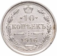 В центре указан номинал «10», ограниченный с обеих сторон звездочками. Над цифрой – Корона Российской империи. Под цифрой номинала — слово "КОПЕЕК". Ниже, расположен декоративный разделитель в виде двух разнонаправленных фигурных линий и стилизованным из точек крестом между ними. Под разделителем — дата выпуска монеты «1916». Вдоль канта, не доходя до короны, изображен венок из лавровой и дубовой ветви, которые в нижней части перевязаны лентой на узел бантом. По окружности канта имеются рельефные элементы, выполненные в виде зубцов.