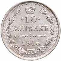 В центре указан номинал «10», ограниченный с обеих сторон звездочками. Над цифрой – Корона Российской империи. Под цифрой номинала — слово "КОПЕЕК". Ниже, расположен декоративный разделитель в виде двух разнонаправленных фигурных линий и стилизованным из точек крестом между ними. Под разделителем — дата выпуска монеты «1916». Вдоль канта, не доходя до короны, изображен венок из лавровой и дубовой ветви, которые в нижней части перевязаны лентой на узел бантом. По окружности канта имеются рельефные элементы, выполненные в виде зубцов.