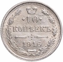 В центре указан номинал «10», ограниченный с обеих сторон звездочками. Над цифрой – Корона Российской империи. Под цифрой номинала — слово "КОПЕЕК". Ниже, расположен декоративный разделитель в виде двух разнонаправленных фигурных линий и стилизованным из точек крестом между ними. Под разделителем — дата выпуска монеты «1916». Вдоль канта, не доходя до короны, изображен венок из лавровой и дубовой ветви, которые в нижней части перевязаны лентой на узел бантом. По окружности канта имеются рельефные элементы, выполненные в виде зубцов.