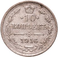 В центре указан номинал «10», ограниченный с обеих сторон звездочками. Над цифрой – Корона Российской империи. Под цифрой номинала — слово "КОПЕЕК". Ниже, расположен декоративный разделитель в виде двух разнонаправленных фигурных линий и стилизованным из точек крестом между ними. Под разделителем — дата выпуска монеты «1916». Вдоль канта, не доходя до короны, изображен венок из лавровой и дубовой ветви, которые в нижней части перевязаны лентой на узел бантом. По окружности канта имеются рельефные элементы, выполненные в виде зубцов.