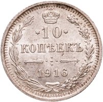 В центре указан номинал «10», ограниченный с обеих сторон звездочками. Над цифрой – Корона Российской империи. Под цифрой номинала — слово "КОПЕЕК". Ниже, расположен декоративный разделитель в виде двух разнонаправленных фигурных линий и стилизованным из точек крестом между ними. Под разделителем — дата выпуска монеты «1916». Вдоль канта, не доходя до короны, изображен венок из лавровой и дубовой ветви, которые в нижней части перевязаны лентой на узел бантом. По окружности канта имеются рельефные элементы, выполненные в виде зубцов.