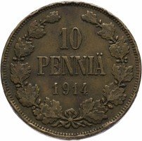 В центре надпись в три строки: «10»│«PENNIÄ»│«1914». Вдоль канта изображён не замкнутый венок из двух дубовых ветвей, которые, в нижней части, перевязаны лентой на узел двойным бантом. По окружности канта имеются рельефные элементы, выполненные в виде зубцов.