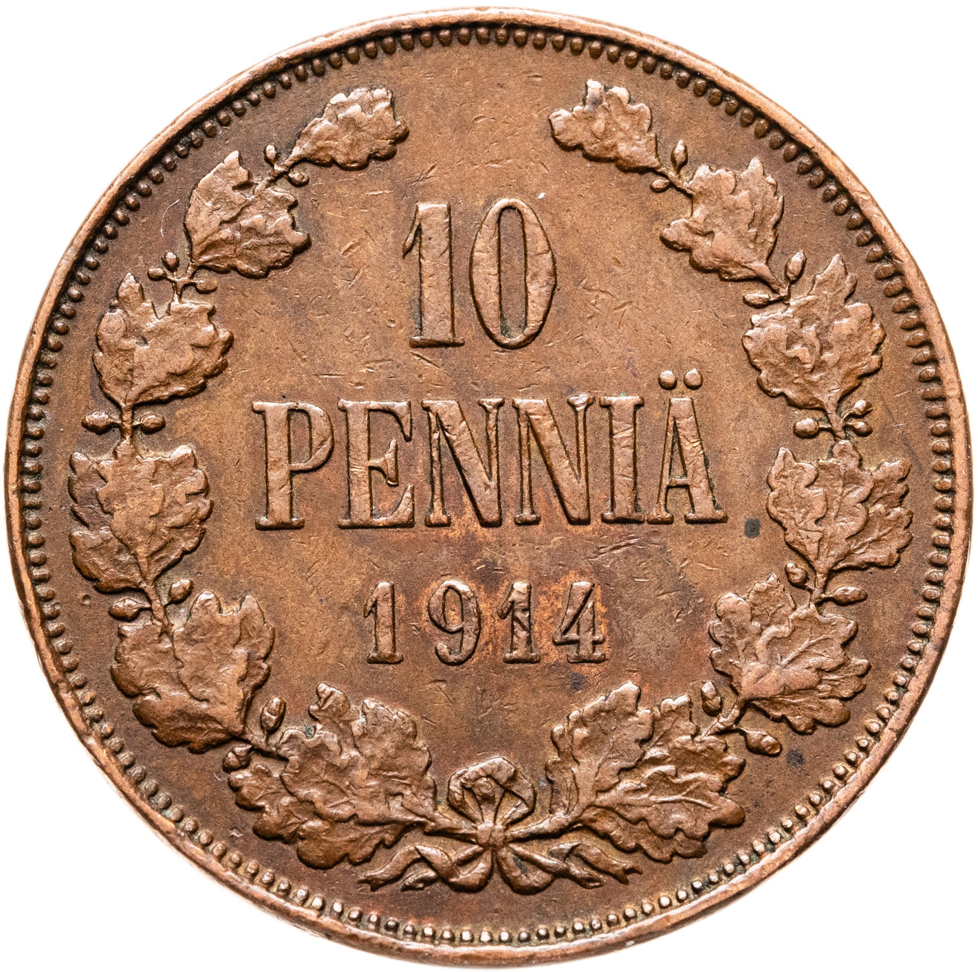 В центре надпись в три строки: «10»│«PENNIÄ»│«1914». Вдоль канта изображён не замкнутый венок из двух дубовых ветвей, которые, в нижней части, перевязаны лентой на узел двойным бантом. По окружности канта имеются рельефные элементы, выполненные в виде зубцов.