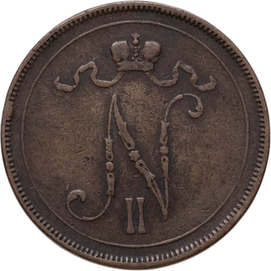 В центре надпись в три строки: «10»│«PENNIÄ»│«1897». Вдоль канта изображён не замкнутый венок из двух дубовых ветвей, которые, в нижней части, перевязаны лентой на узел двойным бантом. По окружности канта имеются рельефные элементы, выполненные в виде зубцов.