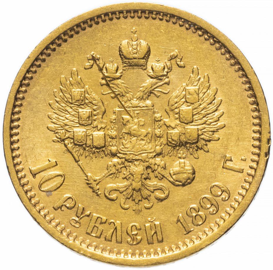 В центре изображен Малый Государственный Герб Российской империи - двуглавый орёл, головы которого увенчаны двумя коронами, третья, большая корона над ними. Все они соединены орденской лентой ордена Св. апостола Андрея Первозванного. На груди орла расположен Московский герб - щит с изображением Георгия Победоносца с копьём поражающего дракона. Вокруг щита цепь ордена Св. апостола Андрея Первозванного. На крыльях изображены гербы: Царства Казанского, Польского, Херсонеса Таврического, Астраханского, Сибирского, Грузинского и герб соединенных княжеств Киевского, Новгородского и Владимирского — по 4 на каждое крыло. В правой лапе орла – скипетр, в левой – держава. Под ним слева направо изображены: номинал - надпись «10 РУБЛЕЙ» и дата выпуска «1899 Г.». По окружности канта имеются рельефные элементы, выполненные в виде зубцов.
