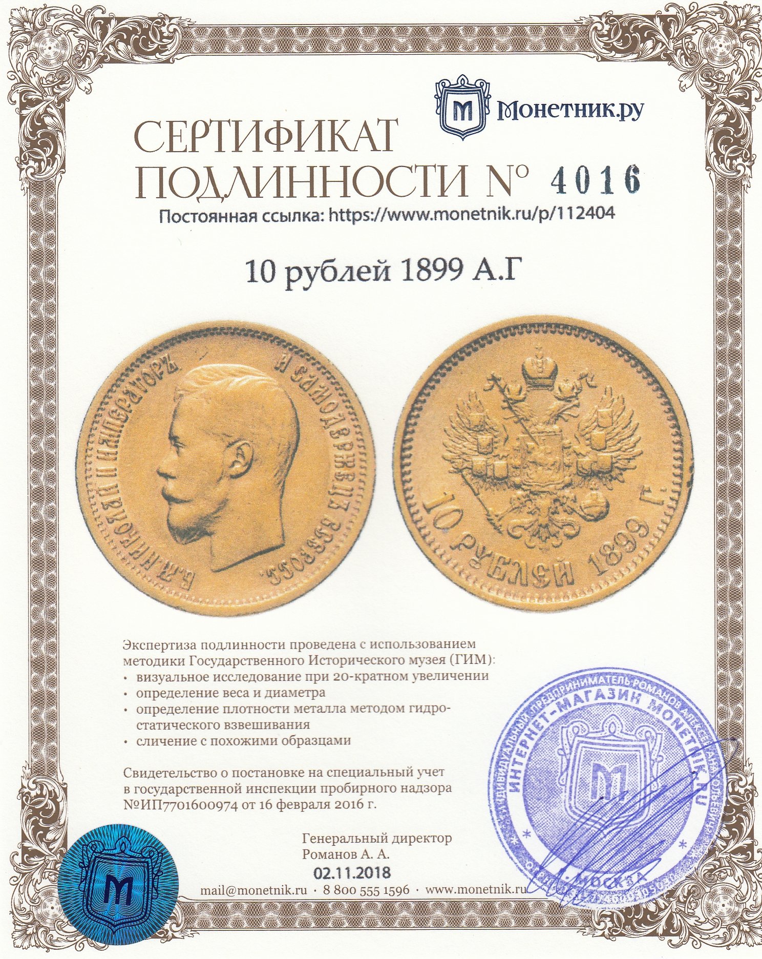 • Сертификат подлинности: № 4016