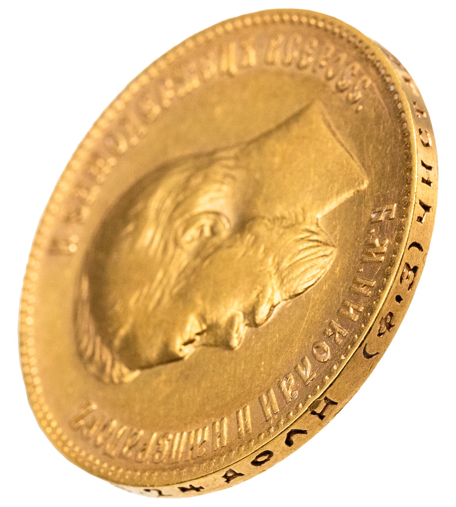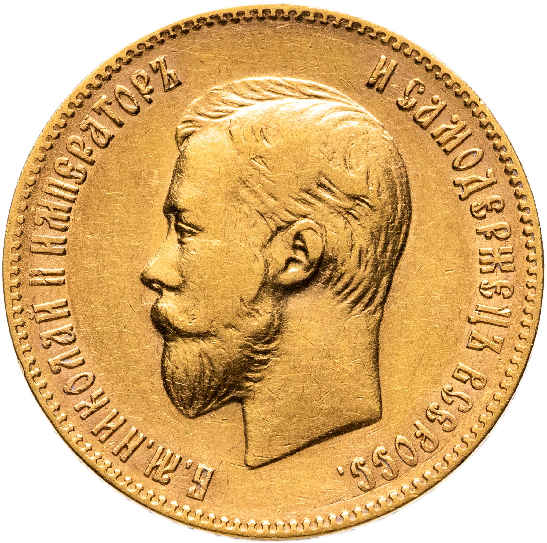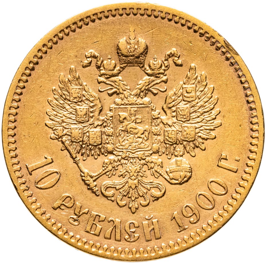 В центре изображен Малый Государственный Герб Российской империи - двуглавый орёл, головы которого увенчаны двумя коронами, третья, большая корона над ними. Все они соединены орденской лентой ордена Св. апостола Андрея Первозванного. На груди орла расположен Московский герб - щит с изображением Георгия Победоносца с копьём поражающего дракона. Вокруг щита цепь ордена Св. апостола Андрея Первозванного. На крыльях изображены гербы: Царства Казанского, Польского, Херсонеса Таврического, Астраханского, Сибирского, Грузинского и герб соединенных княжеств Киевского, Новгородского и Владимирского — по 4 на каждое крыло. В правой лапе орла – скипетр, в левой – держава. Под ним слева направо изображены: номинал - надпись «10 РУБЛЕЙ» и дата выпуска «1900 Г.». По окружности канта имеются рельефные элементы, выполненные в виде зубцов.