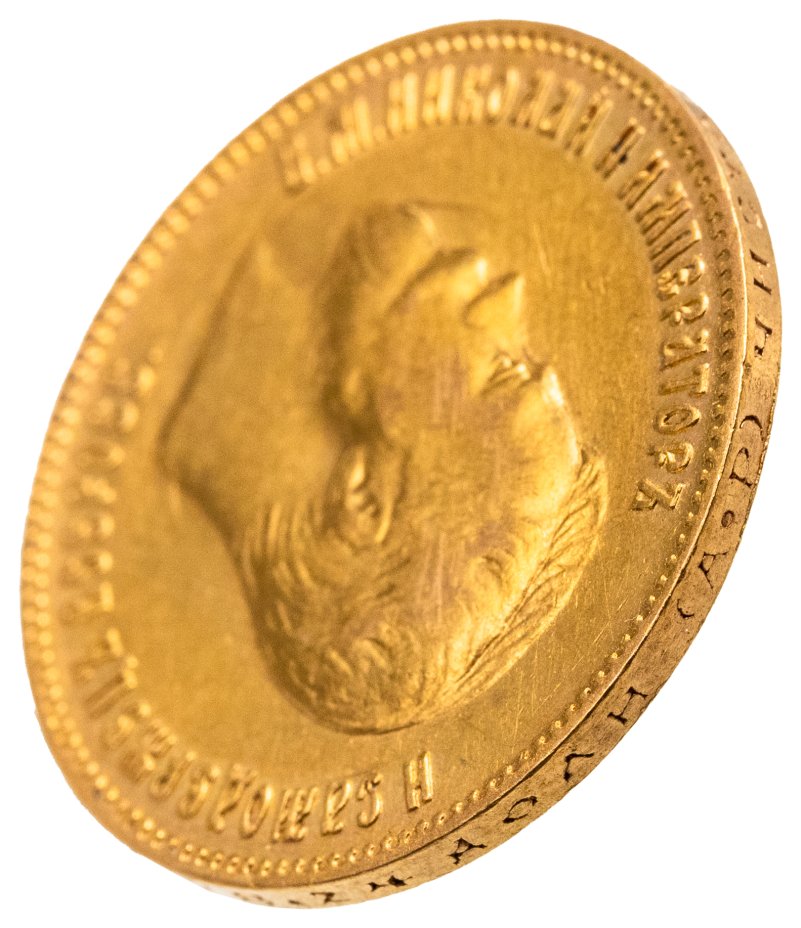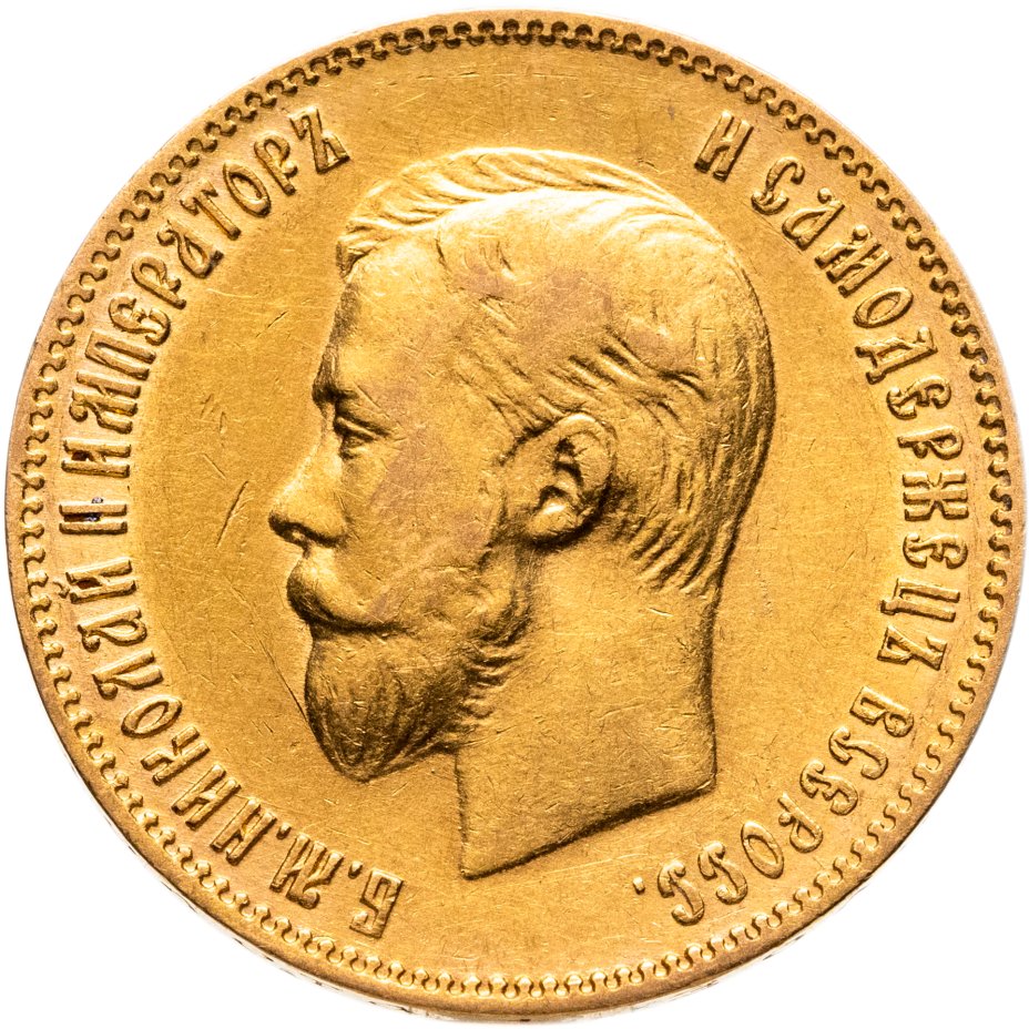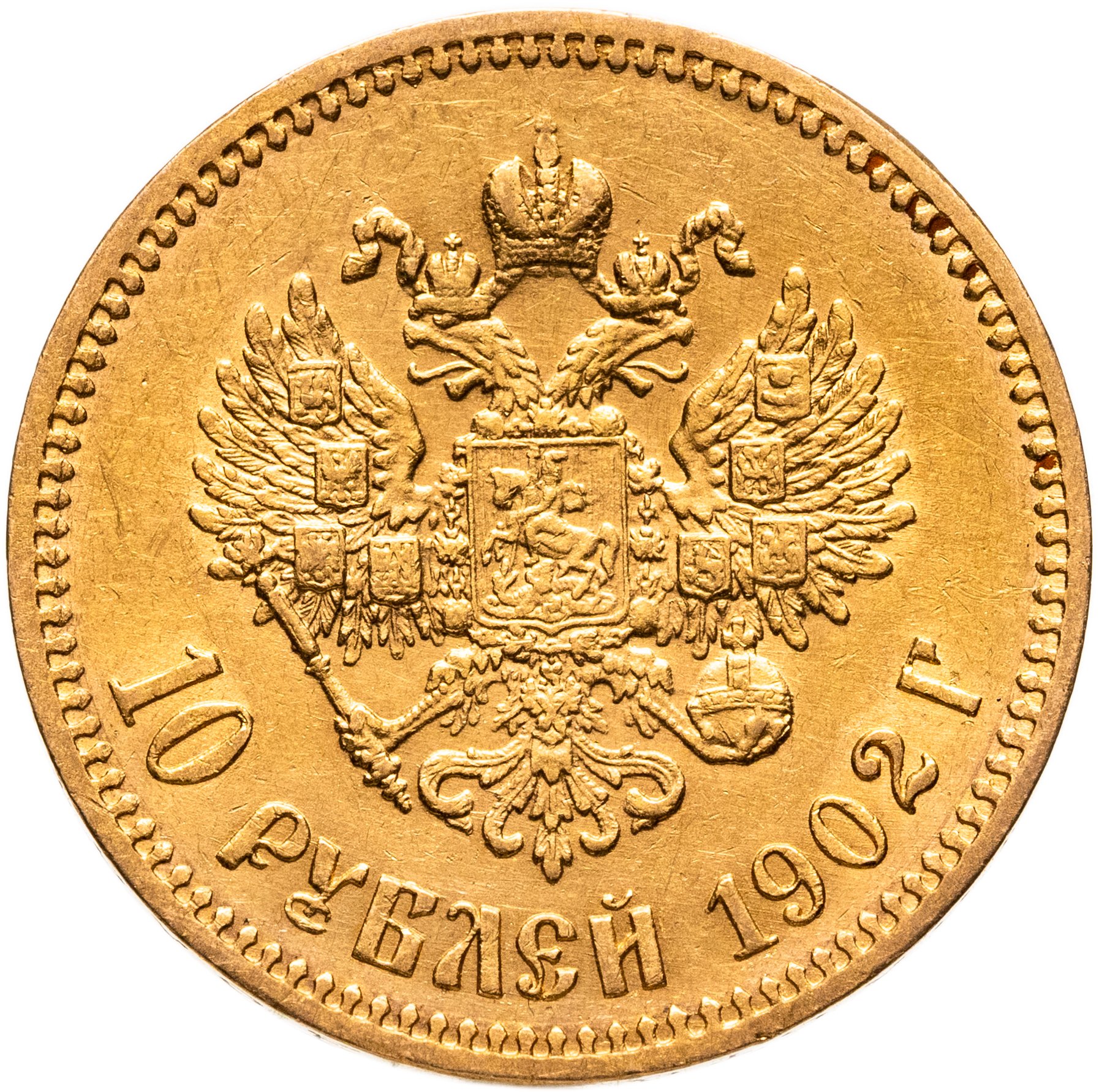 В центре изображен Малый Государственный Герб Российской империи - двуглавый орёл, головы которого увенчаны двумя коронами, третья, большая корона над ними. Все они соединены орденской лентой ордена Св. апостола Андрея Первозванного. На груди орла расположен Московский герб - щит с изображением Георгия Победоносца с копьём поражающего дракона. Вокруг щита цепь ордена Св. апостола Андрея Первозванного. На крыльях изображены гербы: Царства Казанского, Польского, Херсонеса Таврического, Астраханского, Сибирского, Грузинского и герб соединенных княжеств Киевского, Новгородского и Владимирского — по 4 на каждое крыло. В правой лапе орла – скипетр, в левой – держава. Под ним слева направо изображены: номинал - надпись «10 РУБЛЕЙ» и дата выпуска «1902 Г.». По окружности канта имеются рельефные элементы, выполненные в виде зубцов.