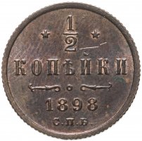 В центре указан номинал «1/2», ограниченный с обеих сторон звездочками. Под цифрой номинала слово — "КОПЕЙКИ". Ниже, расположен декоративный разделитель в виде двух изогнутых линий и небольшой окружности между ними. Под линиями год выпуска монеты "1898" и под ним обозначение монетного двора «С.П.Б.».