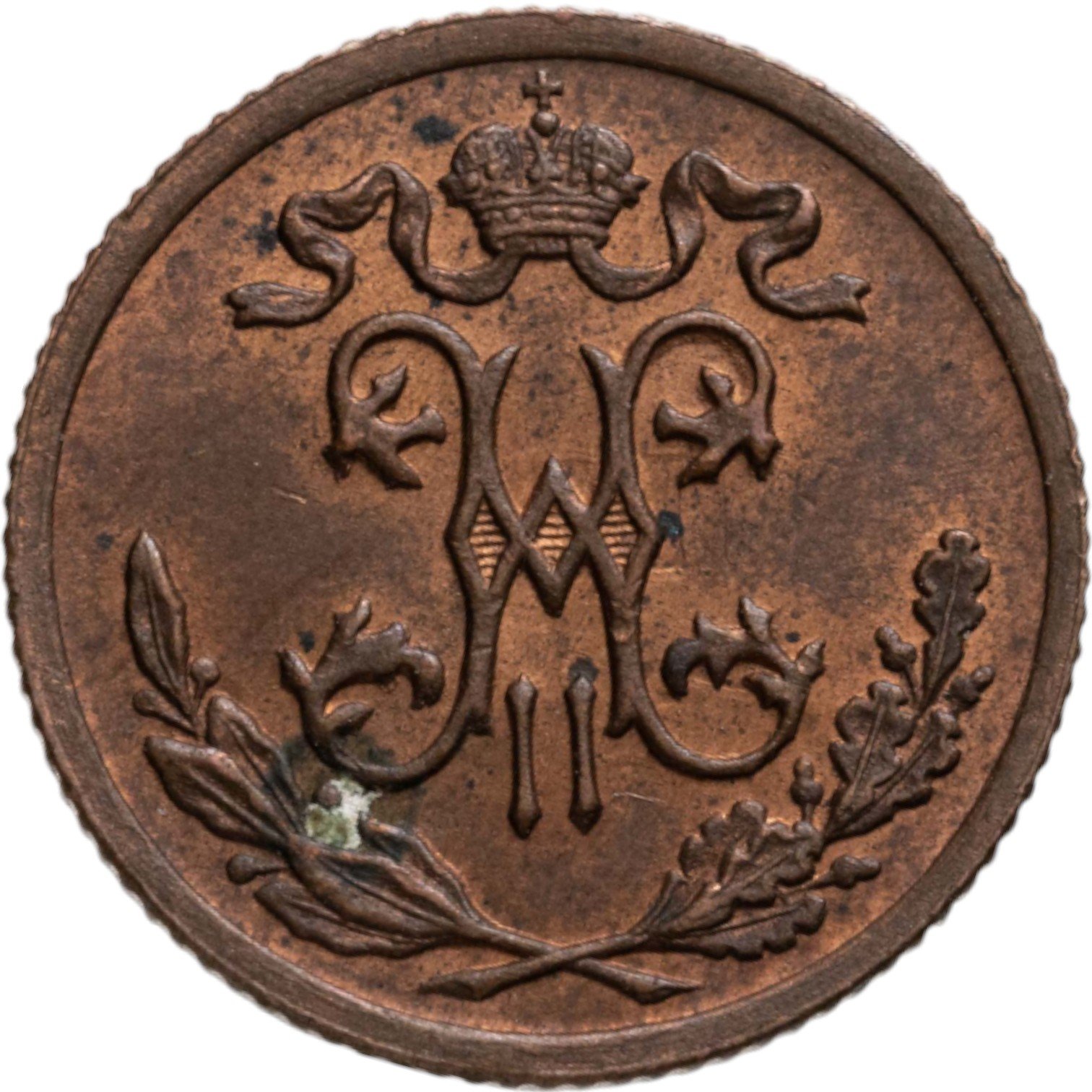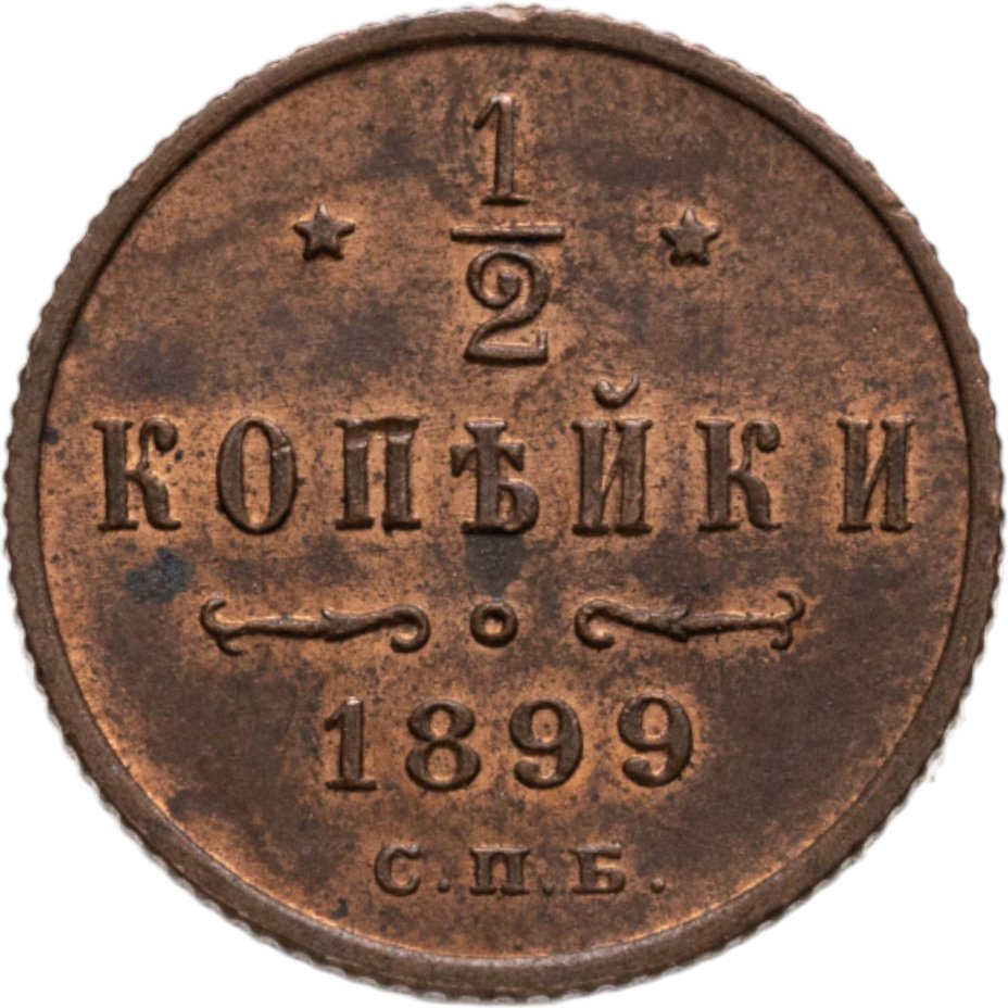 В центре указан номинал «1/2», ограниченный с обеих сторон звездочками. Под цифрой номинала слово — "КОПЕЙКИ". Ниже, расположен декоративный разделитель в виде двух изогнутых линий и небольшой окружности между ними. Под линиями год выпуска монеты "1899" и под ним обозначение монетного двора «С.П.Б.».