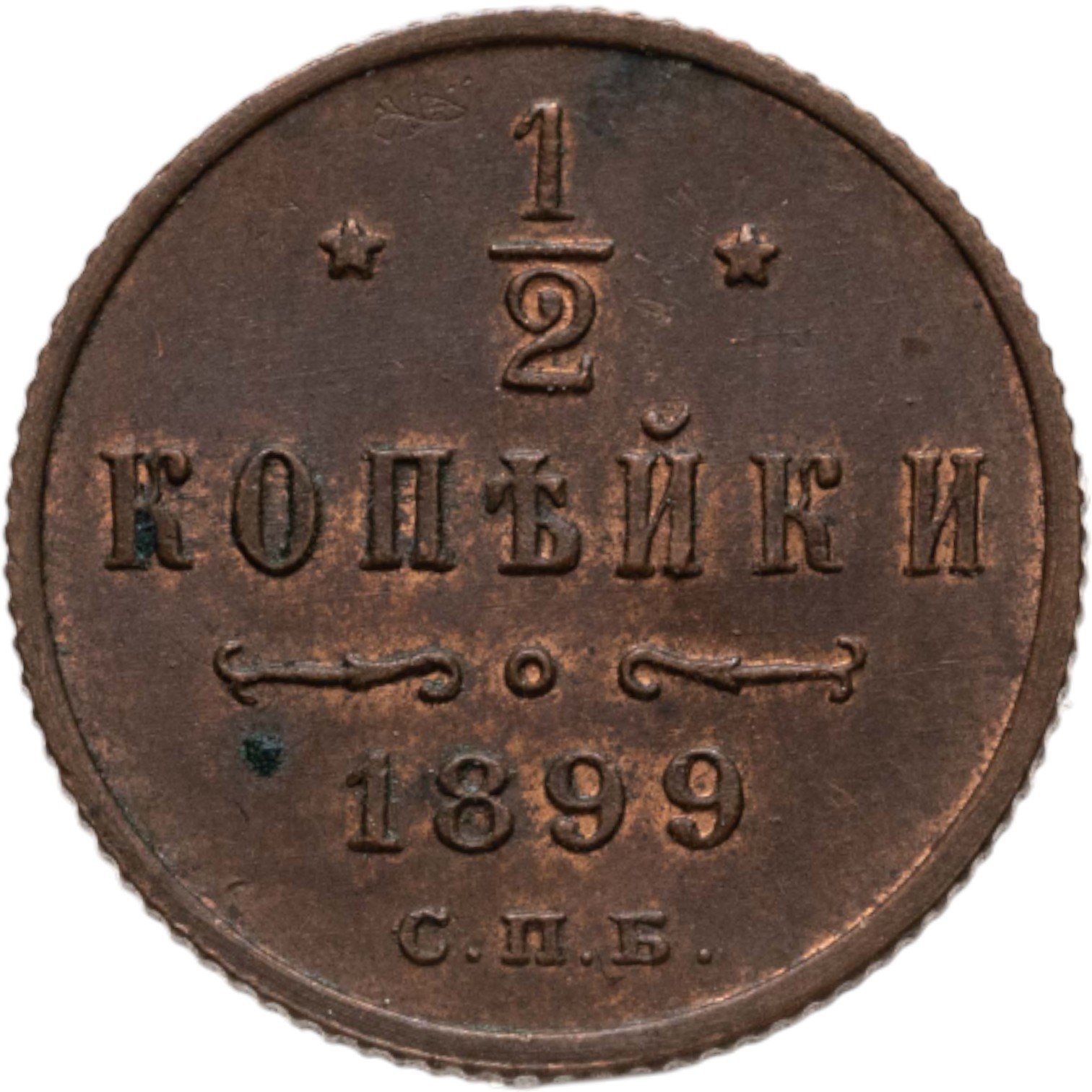 В центре указан номинал «1/2», ограниченный с обеих сторон звездочками. Под цифрой номинала слово — "КОПЕЙКИ". Ниже, расположен декоративный разделитель в виде двух изогнутых линий и небольшой окружности между ними. Под линиями год выпуска монеты "1899" и под ним обозначение монетного двора «С.П.Б.».