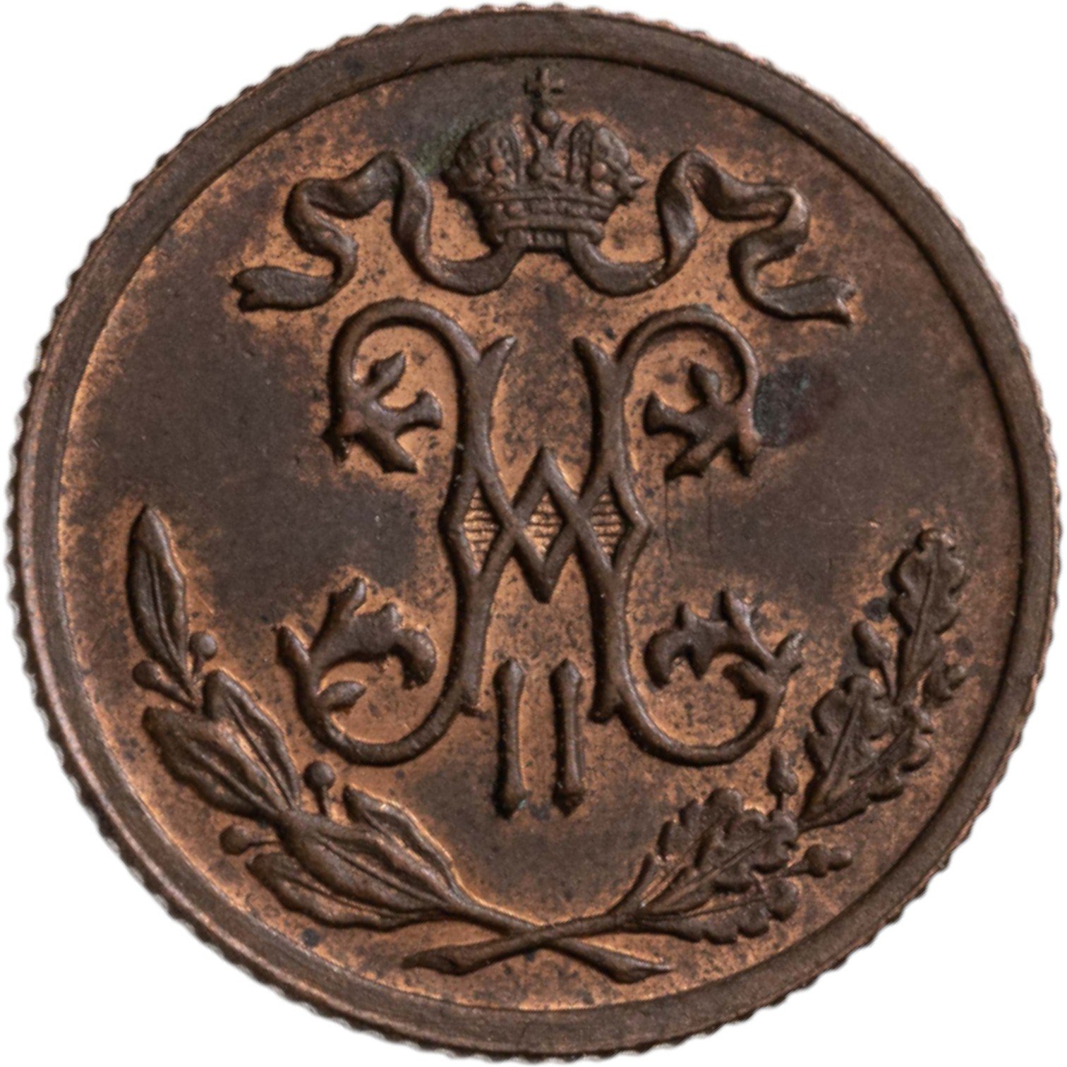 В центре вензель Николая II. Над ним Корона Российской империи с двумя развевающимися концами ленты Ордена Святого апостола Андрея Первозванного. Под вензелем, вдоль канта, две скрещенные ветви: слева лавровая, справа дубовая.