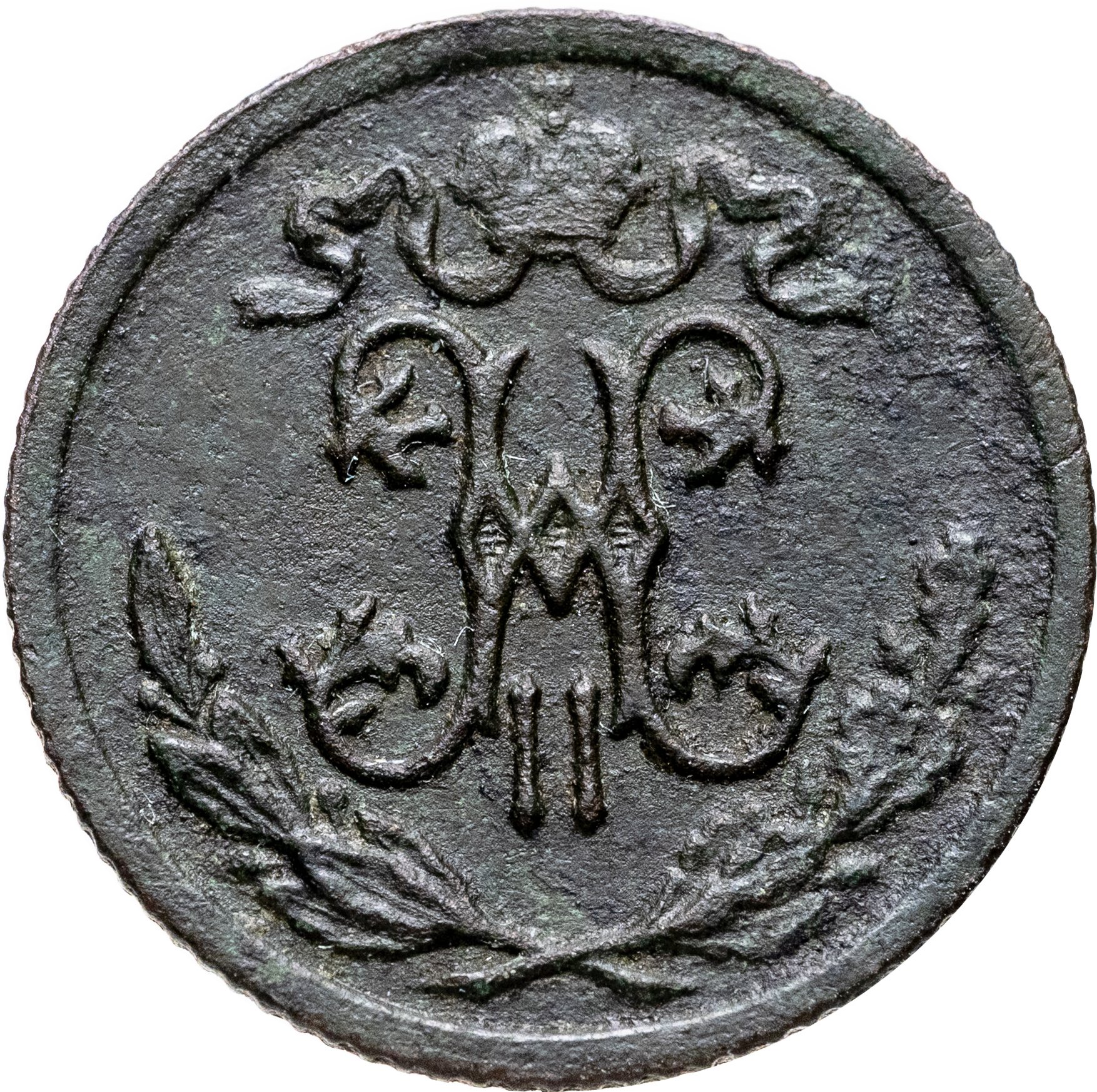В центре вензель Николая II. Над ним Корона Российской империи с двумя развевающимися концами ленты Ордена Святого апостола Андрея Первозванного. Под вензелем, вдоль канта, две скрещенные ветви: слева лавровая, справа дубовая.