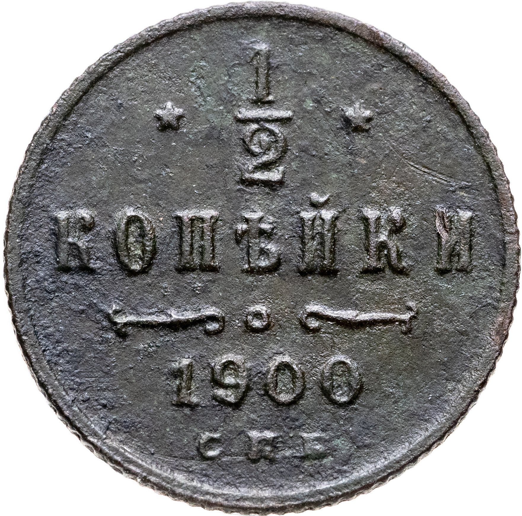 В центре указан номинал «1/2», ограниченный с обеих сторон звездочками. Под цифрой номинала слово — "КОПЕЙКИ". Ниже, расположен декоративный разделитель в виде двух изогнутых линий и небольшой окружности между ними. Под линиями год выпуска монеты "1900" и под ним обозначение монетного двора «С.П.Б.».