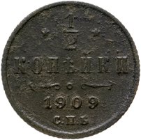 В центре указан номинал «1/2», ограниченный с обеих сторон звездочками. Под цифрой номинала слово — "КОПЕЙКИ". Ниже, расположен декоративный разделитель в виде двух изогнутых линий и небольшой окружности между ними. Под линиями год выпуска монеты "1909" и под ним обозначение монетного двора «С.П.Б.».