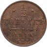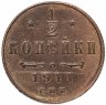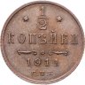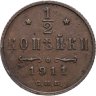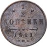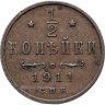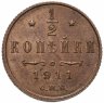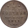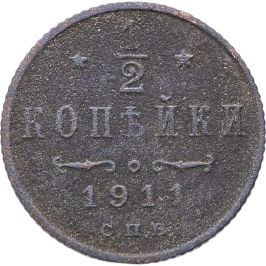В центре указан номинал «1/2», ограниченный с обеих сторон звездочками. Под цифрой номинала слово — "КОПЕЙКИ". Ниже, расположен декоративный разделитель в виде двух изогнутых линий и небольшой окружности между ними. Под линиями год выпуска монеты "1911" и под ним обозначение монетного двора «С.П.Б.».