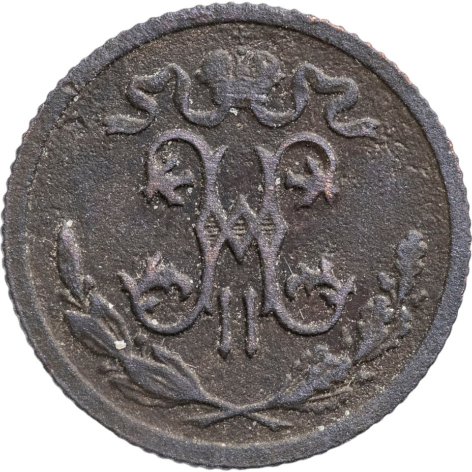 В центре вензель Николая II. Над ним Корона Российской империи с двумя развевающимися концами ленты Ордена Святого апостола Андрея Первозванного. Под вензелем, вдоль канта, две скрещенные ветви: слева лавровая, справа дубовая.